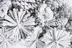 Innevato. Struttura in metallo. Materiale degli aghi pe stampato ad iniezione e PVC decorati con pigne. Rami effetto spazzola che riproducono la struttura degli aghi di pino.