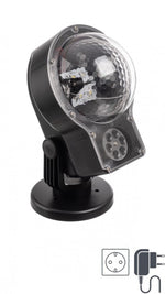 Proiettore Led con effetto nevicata, ideale per personalizzare e illuminare ogni ambiente ricreando la magia della neve combinandola con un decoro Led in movimento. Adatto per uso sia interno che esterno IP44. Due basi incluse, una per superfici piane e una per l'ancoraggio al terreno. Potenza 10W, input AC220-240V/110. Struttura in plastica nera. Dotato di 8 Led.