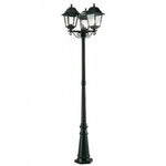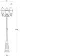 Palo in pressofusione di alluminio. Diffusori in vetro trasparente. Altezza massima della lampada: 210mm. Triangolo di fissaggio a terra. Alimentazione 230 V ~ 50 Hz. Classe di protezione: IP43. Numero di lampade: 3. Potenza massima delle lampade: 100W.