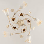 Plafoniera in ferro Avorio Oro vetri Bianchi Ambra cinque luci 70x h15 cm