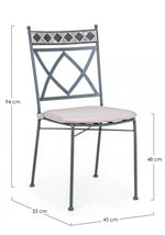 Sedia Berkley in metallo da esterno Caratteristiche del prodotto: Struttura in acciaio trattato per esterno tramite zincatura e verniciato a polvere (poliestere) schienale con decoro in ceramica con lavorazione a mosaico cuscino sfoderabile in tessuto...