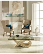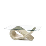 Il tavolino presenta un top in vetro temperato filo lucido, che non solo conferisce un aspetto elegante, ma offre anche una superficie resistente e facile da pulire. Le gambe e la base sono realizzate in pietra fossile white agata, che aggiunge un tocco di raffinatezza e stabilità al tavolino.