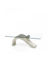 Tavolino (110 x 60 - Trasparente) - Dove - MATERIALI: Top: Vetro temperato filo lucido Gambe / Base: Pietra fossile white agata Struttura Gambe: Compensato marino COLORI: Vetro: trasparente gambe / base: beige DIMENSIONI: 60cm X 110cm H. 40cm