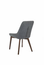 La sedia è realizzata con materiali di alta qualità per garantire durata e resistenza nel tempo. Il rivestimento in tessuto grigio scuro aggiunge un tocco di eleganza, mentre le gambe in massello di noce conferiscono solidità e stabilità.