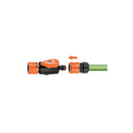 Raccordo automatico con rubinetto che permette di aprire/ chiudere il getto e regolare il flusso d'acqua grazie alla manopola di regolazione prensile.