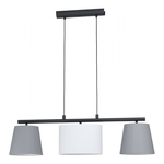 La sospensione ALMEIDA del brand EGLO presenta un profilo con bilanciere in metallo finitura nero con 3 diffusori in tessuto di diverse forme e dimensioni di colore bianco e antracite.