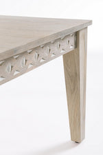 legno mango, verniciatura a base di nitrocellulosa con leggera decapatura bianca. decorazione con intarsi fatti a mano. gambe da assemblare.